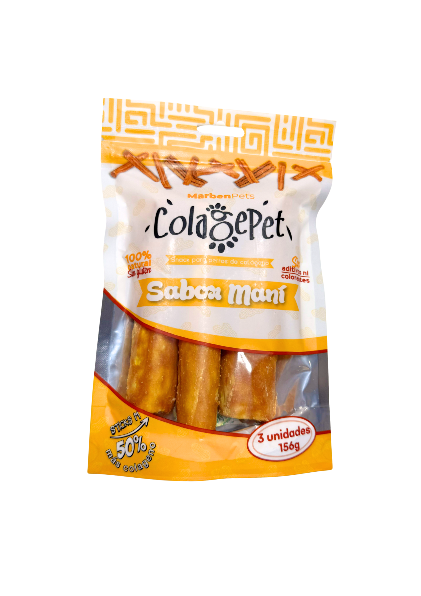 Pack de 3 sticks naturales sabor maní para perros. Elaborado con 50% de colágeno, sin gluten ni aditivos artificiales. Ideal para la salud articular y como premio saludable para tu mascota. Contenido total 150g.