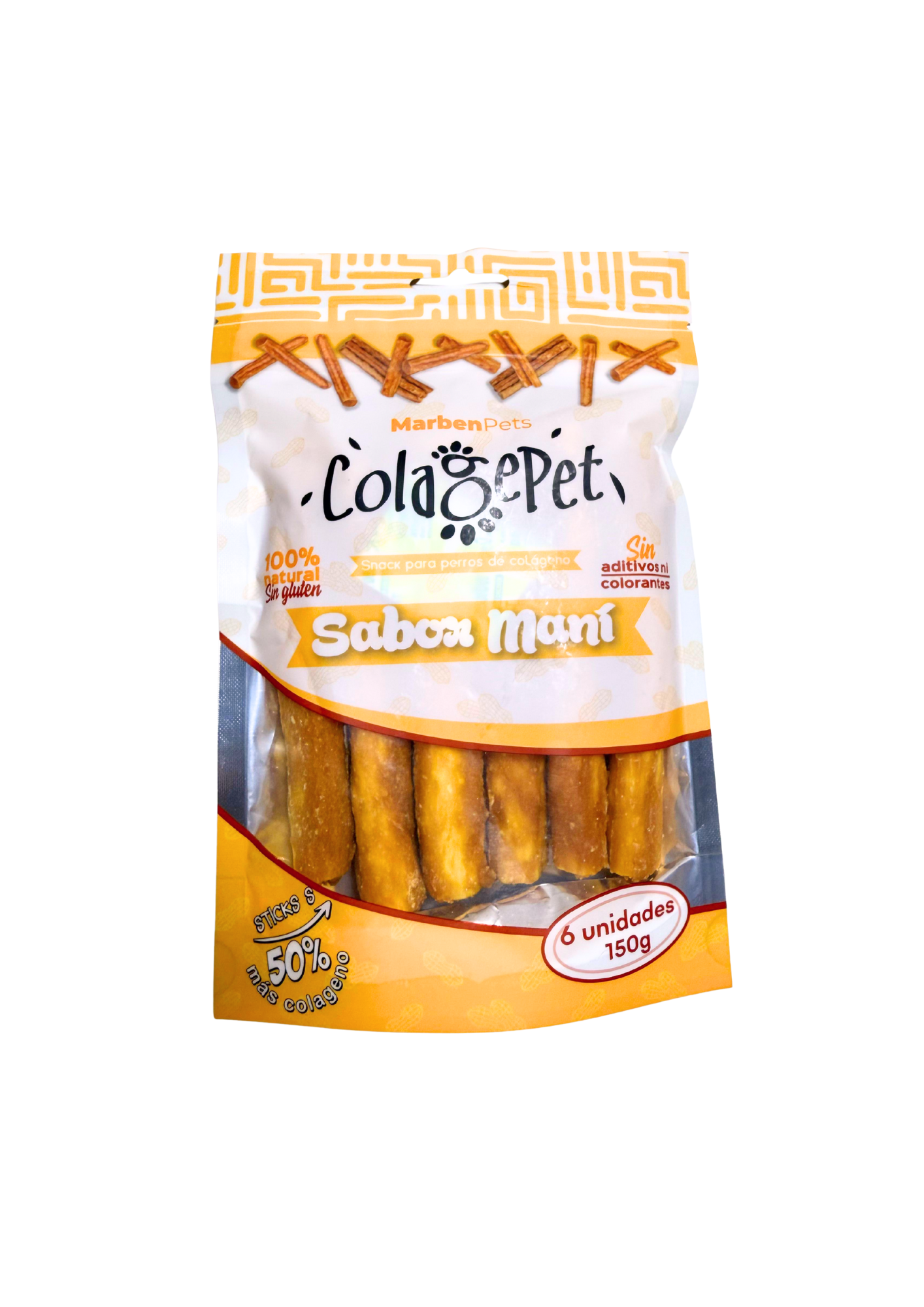 Pack de 6 sticks naturales sabor maní para perros. Rico en colágeno (50%) que beneficia la salud articular y de la piel. Producto 100% natural sin gluten ni colorantes artificiales. Contenido total 150g.