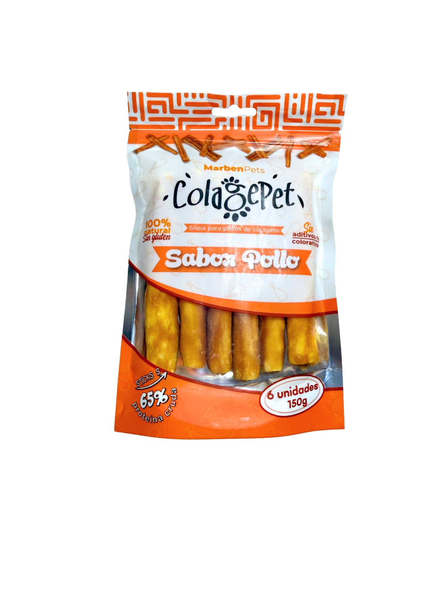 Pack de 6 sticks naturales sabor pollo para perros. Alto contenido de colágeno (65%) beneficioso para las articulaciones y la piel. Snack 100% natural sin aditivos artificiales. Contenido total 150g.